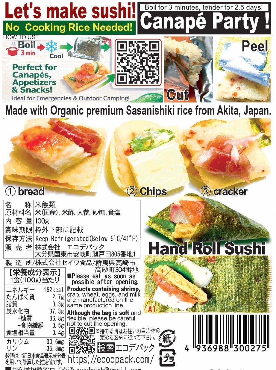 アウトドアにもコンパクトで便利で、ボイル3分ですぐ、袋のまま食器不要で食べられるレトルト寿司飯です。