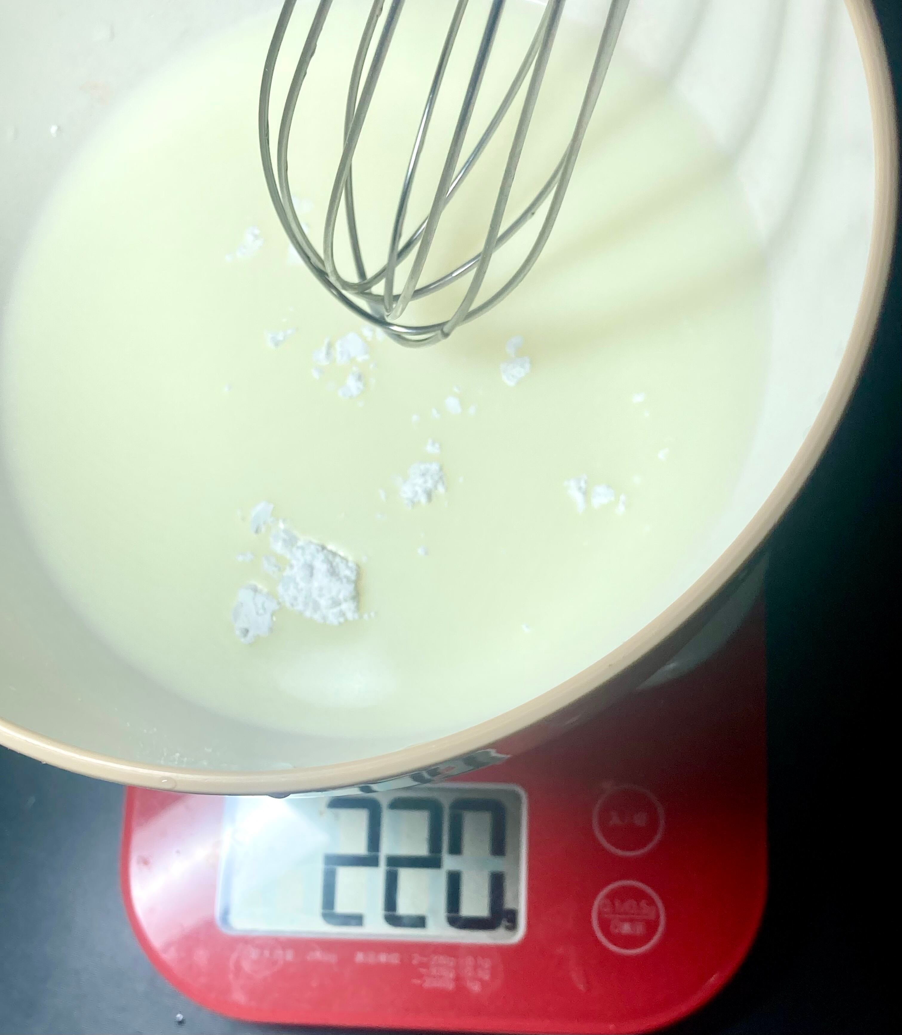 粉20g牛乳200gで溶いて、レンジ2分でホワイトソースになります。