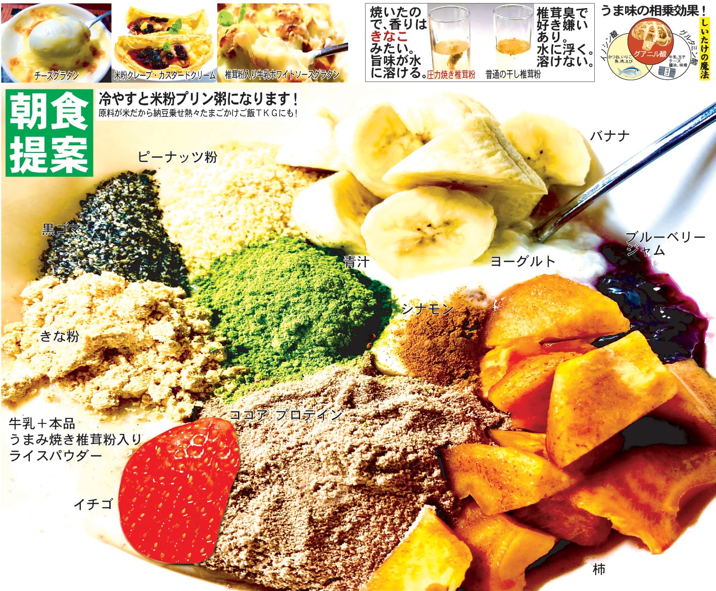 1.焼き椎茸粉入り、高アミロース生米粉/クリームオブライスパウダー1食20g。